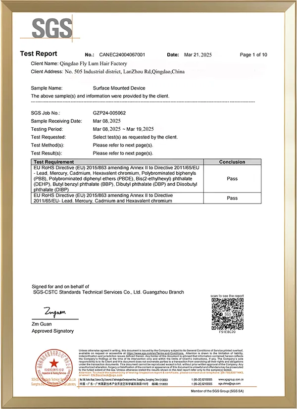 Notre production d'extensions de cheveux est conforme à la norme de l'Union européenne et a passé les certifications CE et RoHS ; nous obtenons la certification Gold Seller.