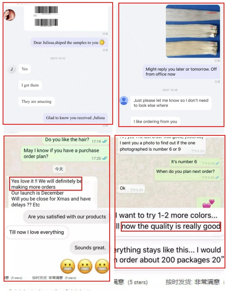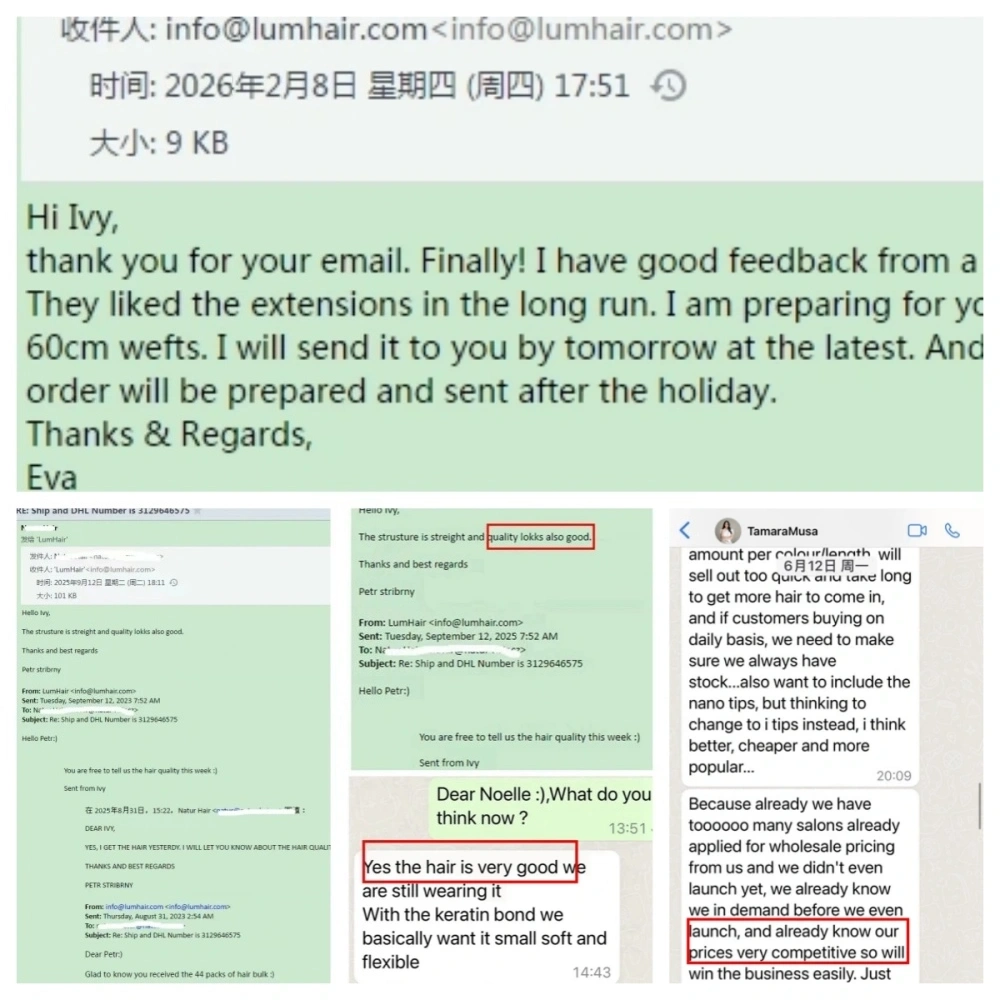 Les clients de Lum Hair sont répartis au Royaume-Uni, aux États-Unis, au Canada, en Australie, au Danemark, en Nouvelle-Zélande, en Norvège, en Allemagne, en France, aux Pays-Bas, en Suède, en Pologne, en République tchèque, en Slovaquie, etc. Ivy, en tant que directrice commerciale, parle couramment l'anglais pour une bonne communication.